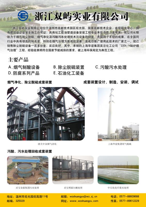 浙江雙嶼實(shí)業(yè)有限公司是從事環(huán)境保護(hù)污水處理、有害氣體處理及制酸成套設(shè)備、化工防腐設(shè)備管道設(shè)計(jì)、制作、安裝和調(diào)試的專業(yè)廠家,創(chuàng)建于1981年。經(jīng)過幾十年的艱苦創(chuàng)業(yè),現(xiàn)已發(fā)展成為領(lǐng)導(dǎo)班子過硬、技術(shù)力量雄厚,具有較強(qiáng)的經(jīng)濟(jì)實(shí)力和高素質(zhì)管理的施工隊(duì)伍,企業(yè)信譽(yù)和科技含量均在國內(nèi)同行業(yè)中處于領(lǐng)先地位,已通過ISO9001、ISO14001管理體系認(rèn)證以及壓力管道元件制造許可,具有化工石油設(shè)備管道安裝工程專業(yè)承包資質(zhì),并取得省建設(shè)廳頒發(fā)的安全生產(chǎn)許可證。